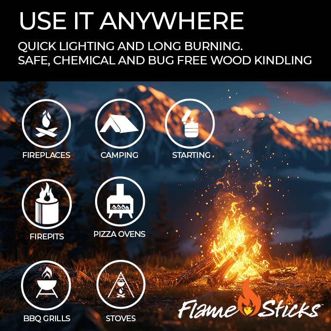 Flame Sticks™ are ideal for kindling or use for popular outdoor products like tabletop fire pits, pizza ovens, wood-burning stoves, BBQs, and more.